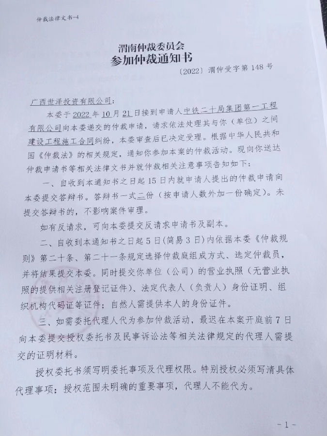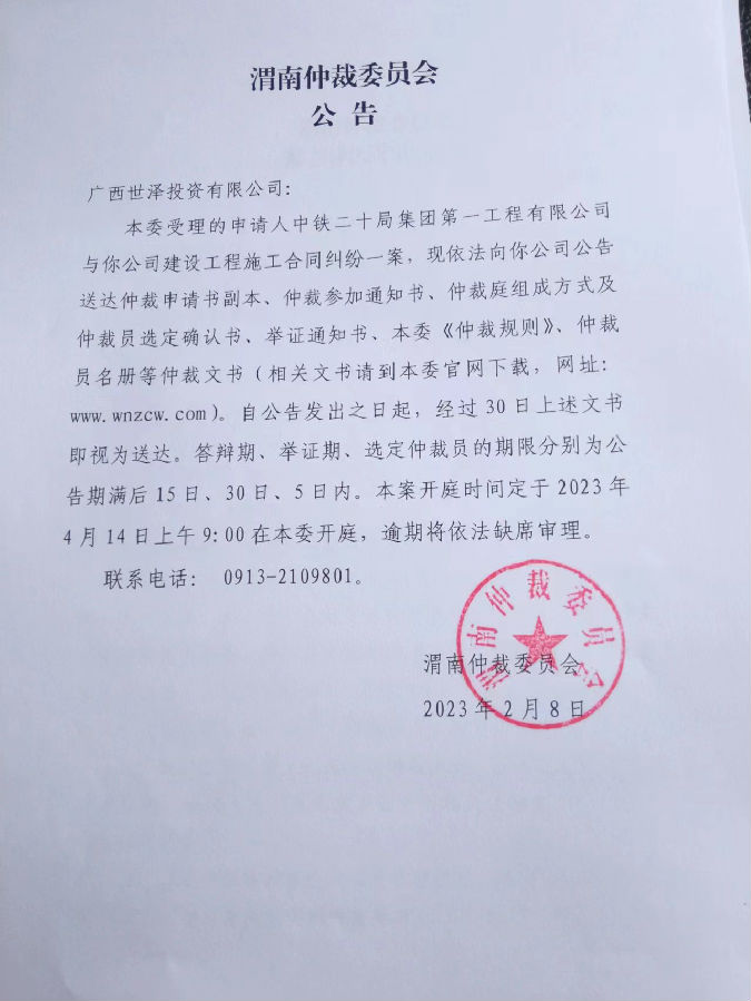 中鐵二十局集團第一工程有限公司與廣西世澤投資有限公司一案公告