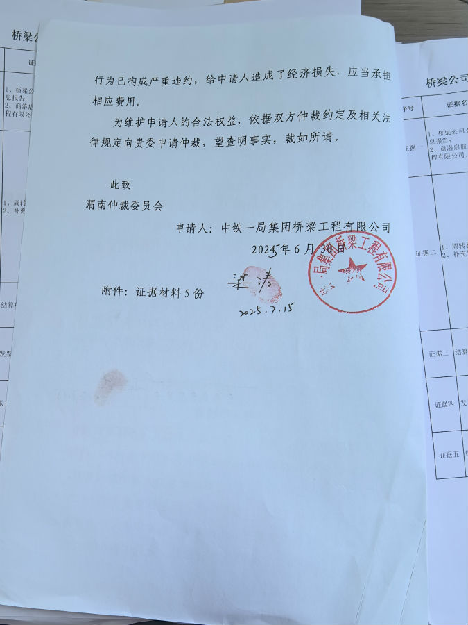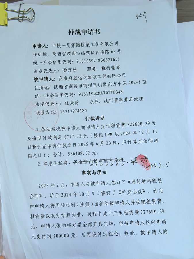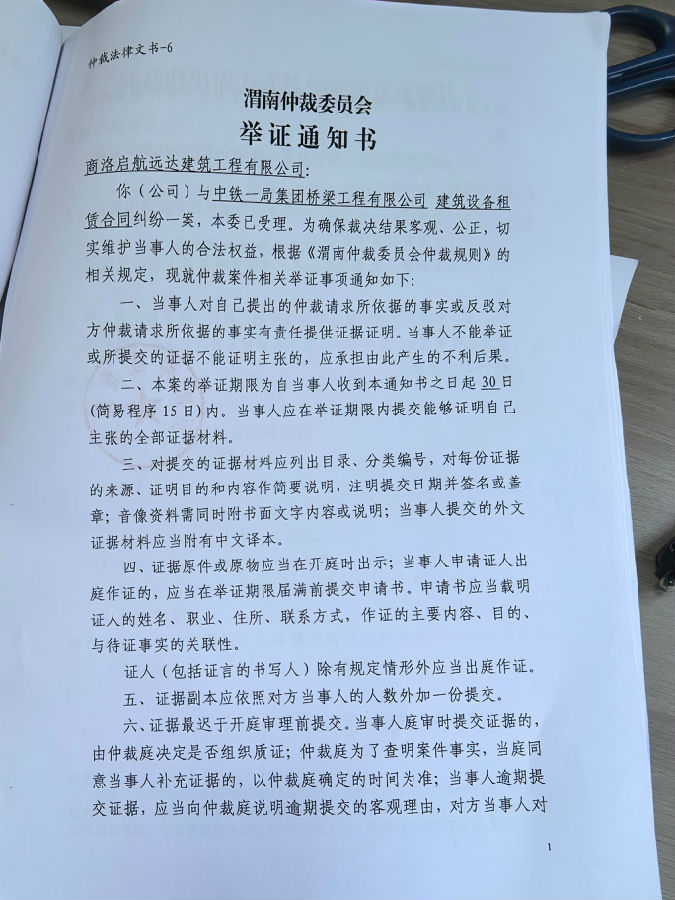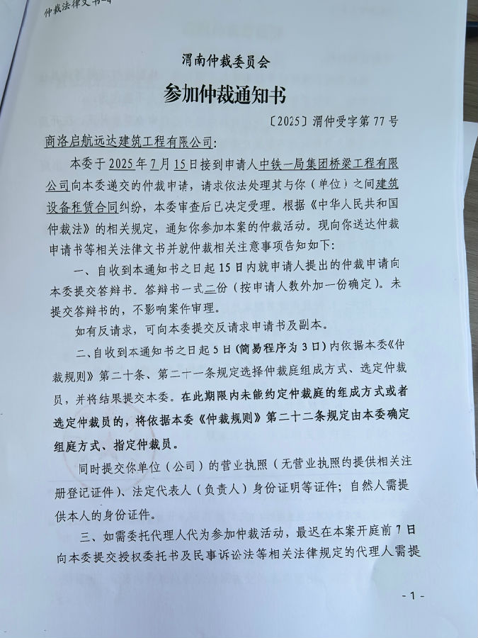 中鐵一局集團橋梁工程有限公司與商洛啟航遠達建筑工程有限公司建筑設備租賃合同糾紛案公告